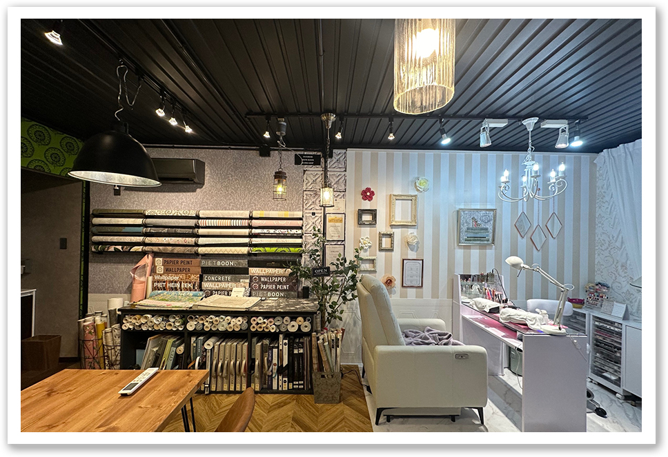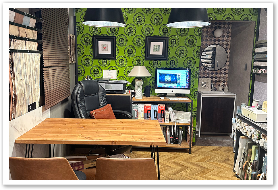 また、壁紙の施工もしており店内にはカタログ等じっくり見て頂ける商談スペースで専門スタッフによるご提案で想像を形にして行きます。
